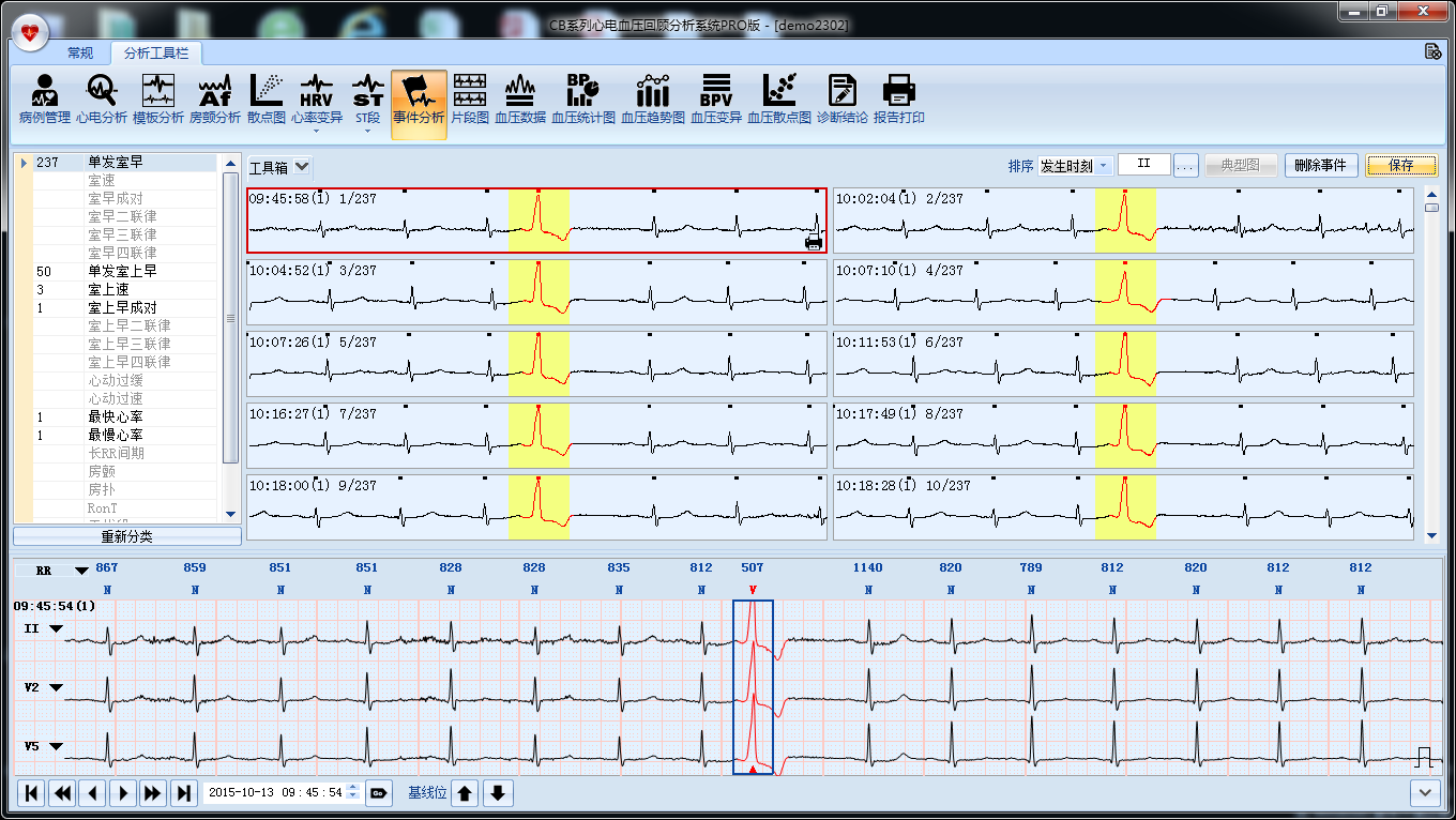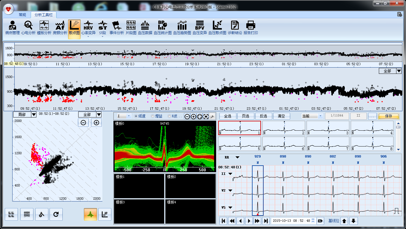 新型散点图分析技术:超过传统模板逐波分类方法,准确性和快捷性大大提高。拥有丰富的散点图类型包含t-RR散点图、Lorenz-RR散点图、分时段散点图、差值散点图、时间三维散点图、t-RR散点缩略图、Lorenz-RR散点缩略图,并通过逆向技术实现散点图与波形叠加图、样本图和标准波形图回溯互动。其中“散点和波形正反逆向技术”、“时间三维散点图”、“基于R波智能移动和添加的伪差批处理技术”、“可变尺度焦点突出反混淆技术”是软件独有功能。